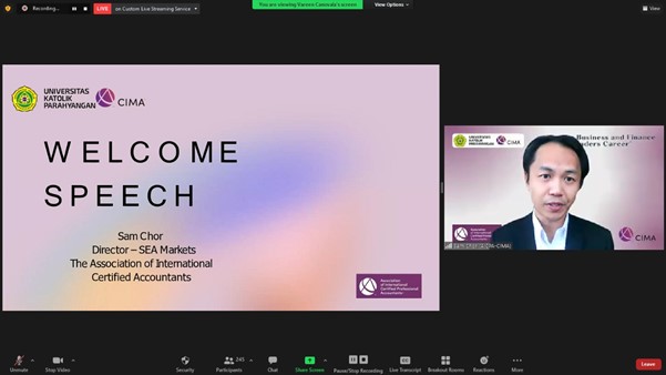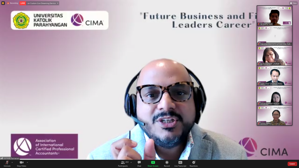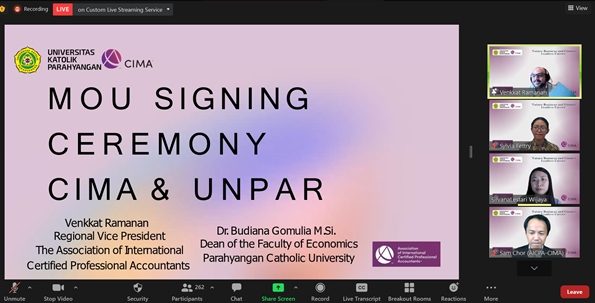 Sabtu, 19 Maret 2022, telah diselenggarakan acara penandatanganan MoU antara Universitas Katolik Parahyangan (UNPAR) dengan Chartered Institute of Management Accountants (CIMA) untuk program Chartered Global Management Accountant (CGMA) dan Finance Leadership Program (FLP). Acara ini diawali dengan penyampaian kata sambutan oleh Ibu Dr.Budiana Gomulia, M.Si (Dekan Fakultas Ekonomi UNPAR), Mr.Sam Chor (Director – SEA Markets The Association of International Certified Accountants), dilanjutkan dengan kuliah umum dengan topik “Future Business and Finance Leaders Career”. Materi ini dipaparkan oleh Mr.Venkkat Ramanan FCMA CGMA (Regional Vice Presiden CIMA – Asia Pacific) dan dimoderatori oleh Ibu Silvana Lestari Wijaya (Senior Specialist, CIMA Markets). Terlihat antusias para peserta pada sesi tanya jawab. Peserta yang hadir pada acara ini adalah mahasiswa beserta dosen-dosen Program Studi Akuntansi UNPAR.