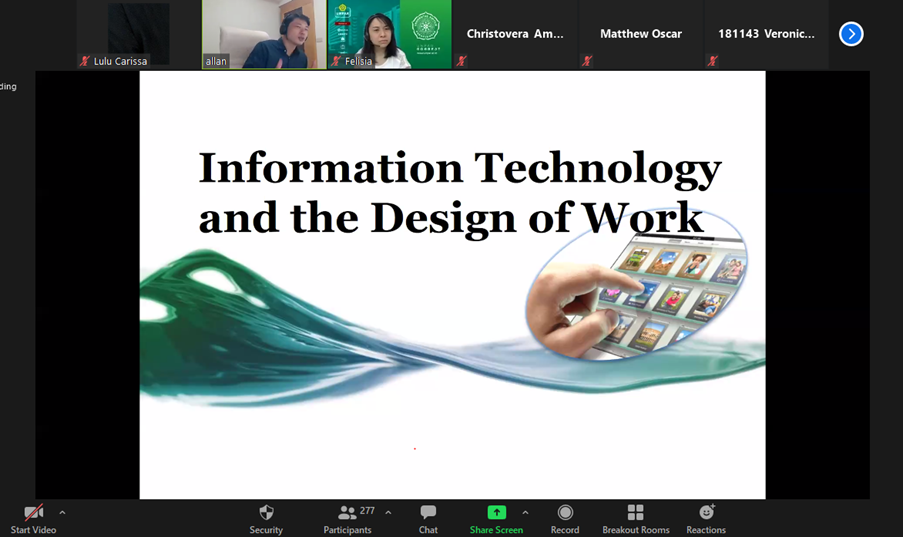 Program Studi Akuntansi UNPAR telah menyelenggarakan guest lecture “Strategic Management” dengan pembicara Ying Chieh Liu, Ph.D (Associate Professor, Department of Information Management Chao Yang University of Technology, Taiwan). Acara ini diselenggarakan selama dua hari, dengan rangkaian acara sebagai berikut: hari pertama, tanggal 22 April 2021 dengan topik “Strategy Safari” dimoderatori oleh Bapak Agustinus Susilo, SE., M.Ak., Ak., CA. Dilanjutkan pada hari kedua, tanggal 23 April 2021 sesi pertama membahas mengenai “Stretegic Use Of Information Systems”, sesi kedua membahas tentang “Applying Information Systems and Technologies Strategically” dimoderatori oleh Ibu Dr. Sylvia Fettry Elvira Maratno, SE., SH., M.Si., Ak ( Ketua Jurusan Akuntansi) dan Ibu Felisia, SE., M.Ak (Ketua Program Studi Akuntansi). Acara ini dihadiri oleh mahasiswa Program Studi Akuntansi dan dosen-dosen Program Studi Akuntansi. Terlihat antusiasme mahasiswa dan dosen di sesi pertanyaan.